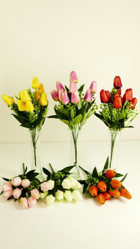 Umelé kvety - kytica tulipán v pestrých farbách s doplnkami, vhodná na výrobu aranžmánov, na výzdobu interiéru.